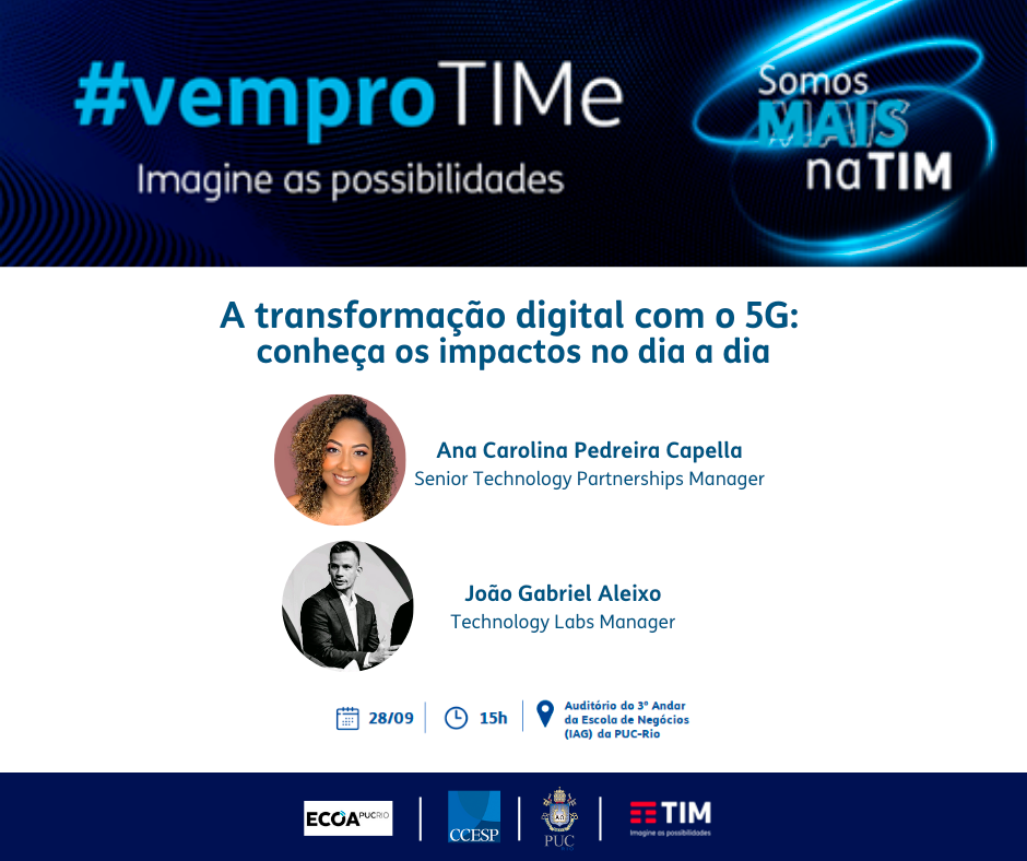 A TIM Brasil, empresa que transforma tecnologia em liberdade, se uniu à PUC-Rio, no dia 28/09, com profissionais tech da empresa para bater um papo sobre a quinta geração de redes móveis.